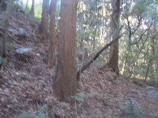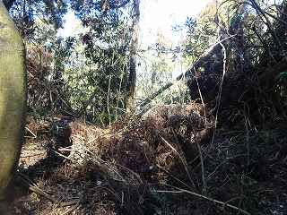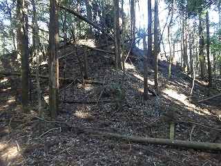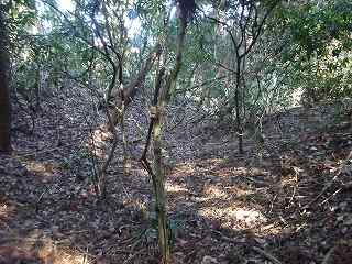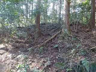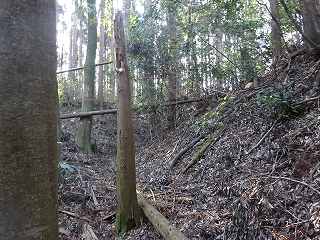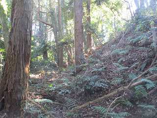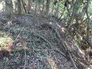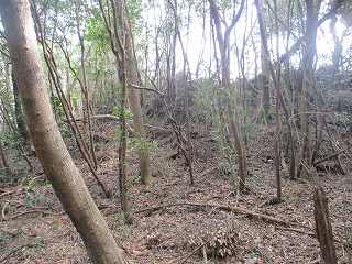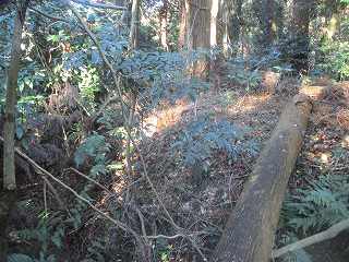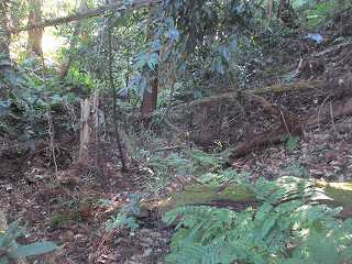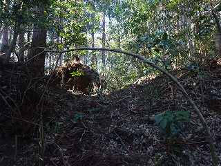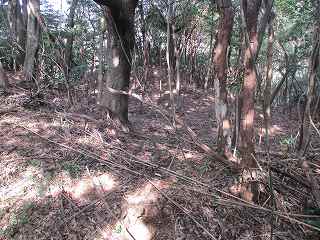 | 相横矢の間の部分にある虎口・・・だが、倒木でよく分からない。こうした倒木のせいで、相横矢がよく分かるような写真を撮ることはできなかった。 | 3郭東側の虎口手前の、やや張り出した部分。その先が虎口となっている。 |