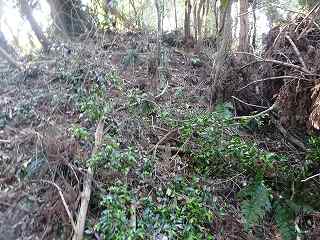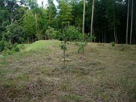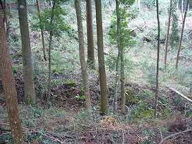 | 二重堀のさらに北側にも、浅い二本の竪堀状のものがある。ただし傾斜はかなり緩やかである。 | 二重堀の外側を南側から見たところ。本来横堀であったのだろうが、削られてしまったために、ただの腰曲輪にしか見えない。 |
