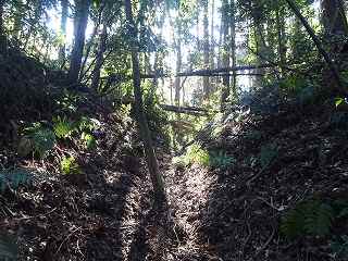 | 鉄塔の方から郭内に向かい、南側の横堀に降りた所。この横堀を進んでいくと、ヤブがひどい上に、中央に溝が掘られていて、歩きにくいったらない。 | 北側の二重堀の内の内堀。深さ4m、幅6mほどの規模である。 |