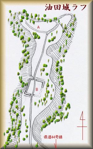 県道44号線沿いに「油田新田」というバス停がある。その辺りから北側の畑地に入っていく未舗装の道が見える。この道をひたすら先端まで進んでいった辺りが城址であるという。