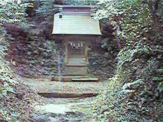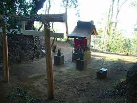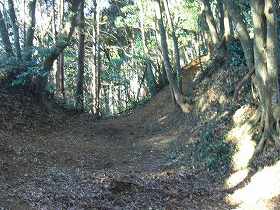 | 横堀。深さ3m、幅6mほどである。 | 南西側の尾根を切り通して、ここに稲荷社が祭られている。 |