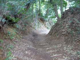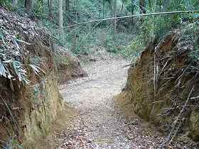 登城口は切り通しの通路となっており、側面部の崖も削り落とされたようになっているのだが、削り方が新しいようで、これは神社の参道として造られたものであろう。この切り通しは雨天時にかなり水が流れるらしく、すでに底が崩落しつつあって歩き辛い。