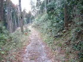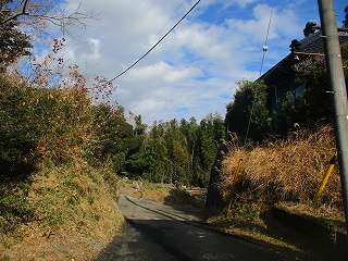 小見川東急ゴルフクラブの西側を南北に通る道を走って行くと、堺宮神社の少し北側辺りに、西側の山稜に入って行く未舗装林道が付けられている。これが入口となっている。