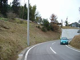 左の写真の中央部Aの辺りから、二重堀の外側の堀を見たところ。車道のために削られてしまっているが、本来の堀底はもう少し高い位置にあったと思われる。 |
