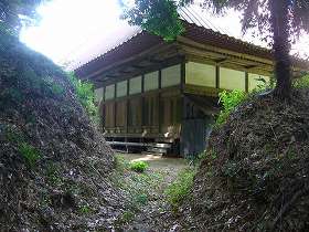 | 大方城は、樹林寺のある台地上にあった。樹林寺そのものが20mほど石段を上がったところにあるが、その背後のさらに20m上がったところが城址の中心であったと思われる。樹林寺から削り落とされたような崖を上がっていくと、神社のあるところに出る。ここは掘切の間のような地形である。 右側の方の郭に上がり、更に右手に進むと、主郭と思われる平坦地があり、その手前には写真のように堀や土塁の跡があり、虎口も残っている。城主は分からないが、この辺りは東氏の一族の向後氏のいた辺りであり、向後氏の城であったことが考えられる。この付近には現在でも向後を名乗る家が多い。 樹林寺は平良文と関係のある夕顔観音を祭ったところで、境内には香取市の天然記念物の「四季桜」や古い宝筺印塔などがある。 |