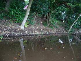 神社の東側には一部池が造られている。その池の脇の土手は比較的高くなっており、池から土手を見ると、いかにも水堀と城塁のように見える。しかし、これも旧状の通りであるのかどうかは不明である。