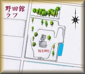 野田館は、小見川城の700mほど南側の水田地帯にある。平地の単郭の居館の跡である。城址は稲生神社のある周辺だったらしいが、遺構はよく分からない。城主等も未詳。