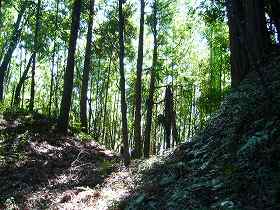 作業小屋から北側に向かって進んで行くと、ちょうど台地基部がネック状に細くなっている個所があり、そこに堀切と土塁が残されている。ここから先が城内ということであろう。それにしても、ネック部が細くその先にけっこうな面積のある台地とは、いかにも城を築くのによさそうな場所である。