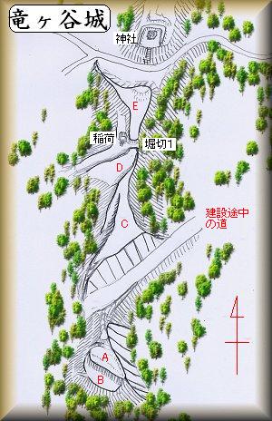 | (以前の記述)竜谷城は、虫幡城、油田城、白井城を結んで三角形を造ったとき、ちょうどその中心点辺りにある。県道55号線と45号線が交差する信号の辺りから西に小道を800mほど入っていった所の比高20mほどの台地上であるが、台地は山林化しており、また、半分ほどが削られてしまっていて、遺構の残存状況ははっきりしない。城主等も未詳。 | |