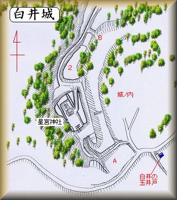 | 神社の近くにある白井の玉井戸。どんな時にも涸れたことはないという。白井の地名のもとにもなっている。 | 星宮神社。周囲にはかなりきちんとした土塁があるが、これは神社に伴うものであろう。 |