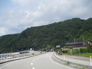 写真の比高60mほどの山が城ヶ山と呼ばれるところで、主郭部の背後を県道によって大きく削り取られているが、この道路はかつての堀切部分を利用して形成されたものであろう。