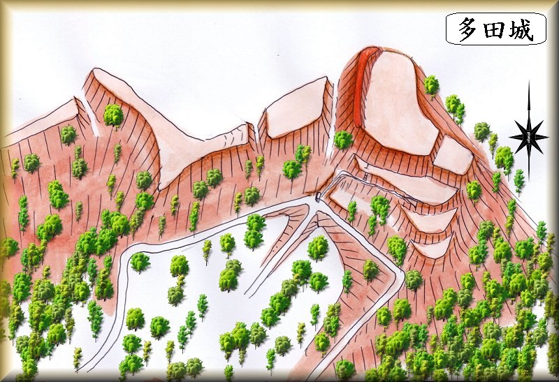 | 東側からの遠望。多田港を見下ろす山上に築かれている。 | 城内の入口。 |