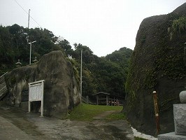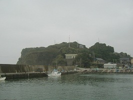| 海の側から小浜城のある半島を見た所。比高20mほどの断崖絶壁の上である。 | 帆万千館跡への入り口(虎口2)。コンクリートで固められているが、これはかつての虎口であろう。おそらく岩盤尾根を断ち切ったものだったと思われる。 |