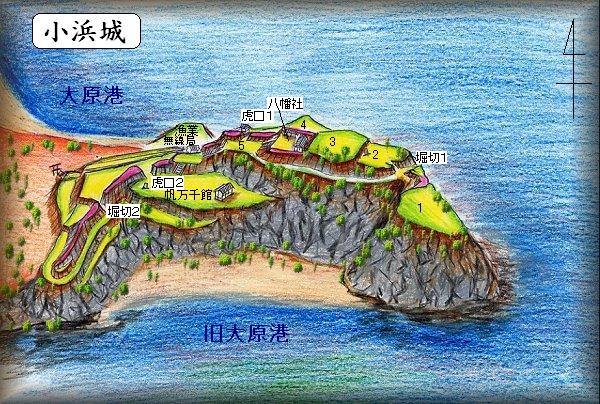 小浜港の南側に突き出した城山(八幡岬)に小浜城は築かれている。周囲みな断崖絶壁の険しい岬である。この断崖上に複数の郭を配置し、陸続きの方に何段かの区画を置くといった形式の城であった。