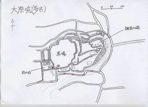 大原城は、喜多地区の東端に突き出した比高16mほどの台地上にあった。大原の公民館や天御中神社が城内にある。大分改変されているようで旧状はつかみにくいが、ざっと歩いた状況を簡単な図にしてみた。