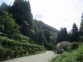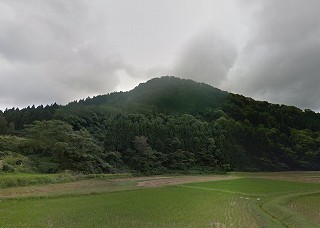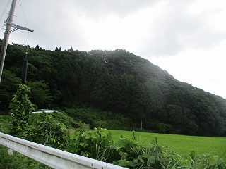 | 南側から遠望する岩首城。 | この辺りから農作業用の道に入り込んで行く。 |