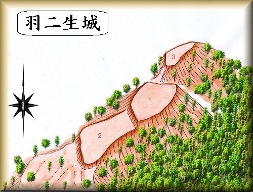 蝦夷ヶ城と呼ばれている所で、図面を見てみると、三角点になっている山頂に20×15mほどの高台と二郭ほどがある。中央部に高さ1m、幅2mほどの土手が100mほどにわたって続いている。