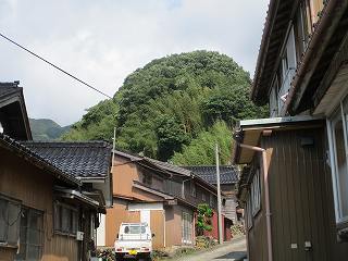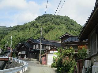 西側の腰曲輪にある家の屋号を「城」という。海上のフェリーから三角形の宇賀神山がよく見える。その左隣の台地である。