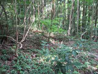 山稜上はけっこう広く削平されており、これが郭である。北側に進んで行くと、北端に土塁があり、その先が切岸となって区画されていた。「櫓台が残る」というのはこの土塁のことを指しているのであろう。確かに櫓台と言ってもいいようなものであった。