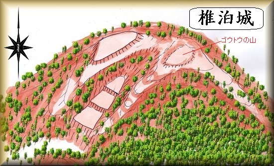 標高352mの「ゴウトウの山」の西側に方20mほどの小郭が4ヶ所ほど残っているという。