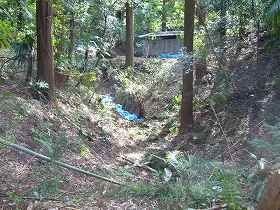 | 3郭北側の堀。といっても深さ1.5mほどである。幅も狭く、もともとかなり小規模なものであったのだろう。 | 2郭と3郭との間の堀。といっても痕跡状態でしかない。幅も3mほどしかないので、これも埋まる前からかなり小規模なものであったのだろう。 |