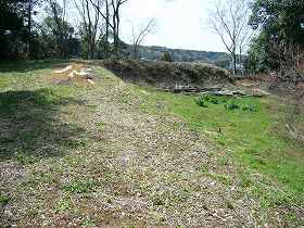 | 1郭土塁。これも内側に削られた跡が見える。 | 1郭横堀。深さ3m、幅4mほど。 |