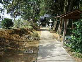 | 1郭にある浅間神社。左側の台地端部分は少し削られているようだ。 | 1郭の北側の土塁上から、虎口方向を見たところ。 |