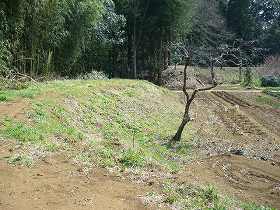 | 南側から北側に向かって延びる土塁を見た所。 土塁は北側に向かっていくにつれて段々低くなっていき、北側では、それほどの高さもない。また、単郭方形と述べたが、実際の所、北側に向かって段々狭くなっておおり、台形というべきであるかもしれない。 そうして郭は次第に狭くなり、やがて台地下に続く道と接続する。この部分にも小さな虎口がある。 |