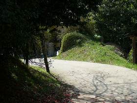| 西側の台地続きの方から進んでいくと、切通しの道を通って、やがて写真の虎口が見えてくる。(郭の南側) 左手の土塁はなかなか見事なもので、高さ2mほどはある。この写真の右手にも土塁はあり、上には何かの祠が祭られている。 |