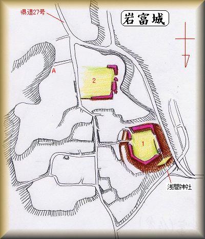 | (以前の記述) 岩富城は本佐倉城の支城の1つで、城主は原左右衛門尉景広といわれている。佐倉から八街へ向かう途中の比高25mほどの台地上にあり、現在では、浅間神社のある主郭のみが明瞭に認められるが、この図面からすると、規模はかなり大きく、かつては台地全体に縄張りが広がっていたらしい。 |