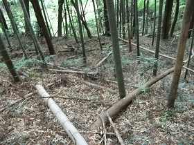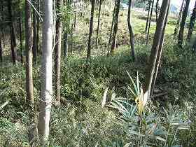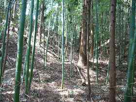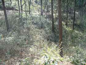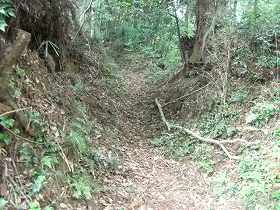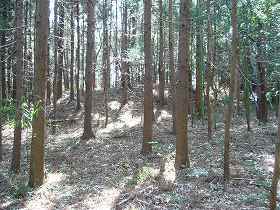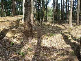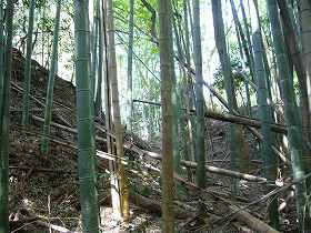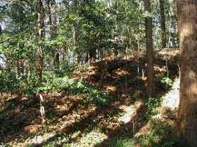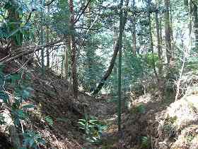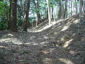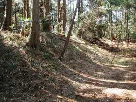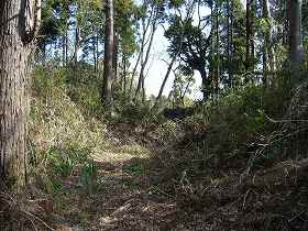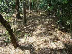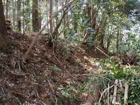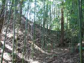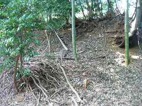 | 1郭北側の城塁を西側から見た所である。高さ2mほどであるが、土塁上には5mほどの幅がある。 また、1郭の南側は幅6mほどの細長い郭しかない。その先は断崖で、自然の沢が竪堀のようになっているところもある。 |