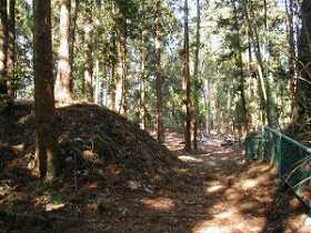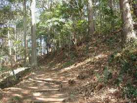 | 遊歩道を上がっていくと、1郭の城塁が見えてくる。右側が1郭で、この登り口は、2mほどの段差を通って、そのまま3郭の郭内に通じている。写真の左側が3郭となる。 | 1郭の南側の土塁。1郭は20m×30mほどの広さである。1郭の北側と東側には2mほど下に腰曲輪が造られている。腰曲輪の幅は5mほどである。 |