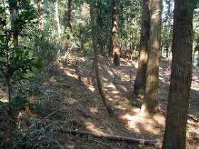 というわけで、ざっと歩いてみた。確かに神社の西側には二本の緩い竪堀状の切り通しがある。しかし、これはどうみても堀切ではなく通路であろう。ただ、二重になっているのがちょっと気になる所ではある。