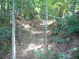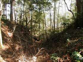 | 1郭北側の横堀。深さ6m、幅8mほどあり、けっこう規模が大きい。 | 1郭南側の腰曲輪。しかし外側がやや盛り上がっており、本来は横堀であった可能性が高い。 |