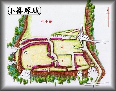 | (以前の記述) 小篠塚城は、本佐倉城から、岩富城へと続く支城網に位置した城で、城主は不明だが、戦国期の特徴を備えた縄張りをしているという。 下の写真の標柱のあるところ(南側の土手下)からは、斜面が急でちょっと登れない。城址に行くには、台地上の牛小屋の所から入っていくのがよい。牛小屋の持ち主の方に一声かけてから入ってみよう。この牛小屋までは、民家の敷地を通って車で上がることができる。 牛小屋の南側に土塁の開口部がある。これがかつての虎口であろう。門があったと思われる。入ると空堀の下である。左側の空堀の底が高くなっている。こちらを通って郭内に入っていくことになる。この上が主郭である。主郭は60m四方くらいの方形の郭で、周囲には土塁が取り巻き、その外側には空堀がある。郭内はすっかり山林化しているが、長い間、木の枝や木の葉が積もりに積もったせいか、空堀は1m〜2mの深さであまり深くはない。しかし、かつてはこの倍くらいの深さはあったのではないかと思われる。 主郭の東側に、同程度の規模の二郭がある。更に、二郭の南側に、方30mの三郭と四郭が東西に並んでいる。この4つの郭が城の中心であったのであろう。三郭四郭も土塁と空堀に囲まれているが、こちらもだいぶ埋まってしまっていて、現在では小規模なものにしか見えない。 これらの郭の北側の、牛小屋の辺りもかつては城内であったと推測されるが、牧舎で改変されてしまっているので、この辺りは旧状を忍ぶよすがもないと言った感じである。 |