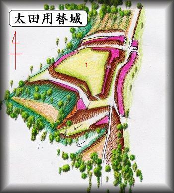 | (以前の記述) 太田用替城は、西側に突きだした用替と呼ばれる半島状の台地上にあった。台地の比高は25mほどで、摩加多神社の裏手の奥が城址に当たる。 城址は山林化していて遺構を確認するのは難しいが「概念図」によると、主郭は100m×60mの方形で、西側に腰曲輪を伴っている。 東南北には土塁と空堀を巡らせているが、北側は要害が悪かったのか、さらに竪堀を2重に巡らせている。「用替」と呼ばれているが、これは要害がなまったものと考えられる。 摩加多神社の北200mほどの畑の奥に、城址が埋もれている。山林化している上に、ゴミが多量に捨てられているので、まさに埋まっている感じだ。 深さ3mほどの空堀を越えて中に入れば、そこが郭内である。山林化していて状況をつかみにくいが、方70mほどの三角形に近い形態であろうか。空堀の内側には土塁が延びている。 土塁は北側の辺りが一番高く、あるいはここは櫓台であったかもしれない。北側は、空堀も深くなっており、こちらは深いところで7,8mはある。天然地形を利用していると思われるが、この方向からの防備は強力である。 この櫓台の所に近づいたところ、急にガサゴソと音がして、駆け出したものがある。すごい勢いだ。見ると狸のようだ。狸の巣があったのであろうか。あちらもびっくりしたのであろうが、こちらも驚いた! 城の歴史等は不明である。「城郭体系」では、本佐倉城に移る前の千葉氏がいた寺崎城とはここのことではないかとある。なぜなら寺崎には城址がなく、ここが寺崎からは近いからだという。 だが、この記述はどうかなと思う。なぜなら、寺崎にはちゃんと城址があるからである。しかもこの城よりも規模が大きい。太田用替城は、単郭の小さな城で、千葉氏が一時的にせよ本拠地とするにはあまりにも小さすぎると言えるのではないだろうか。 この城はやはり、戦国期につなぎの城として用いられた小規模な砦という位置づけが正しいのではないかと思われる。 |