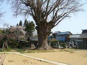 | 寺院西側の入口にある巨大な土塁。虎口の両脇はともに櫓台形状になっており、お堂や金衝き道が建っている。 | 西福寺の大銀杏。本当の巨木である。 |
