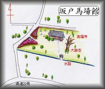 | (以前の記述)坂戸馬場館は、坂戸城の北700mの位置にあり、現在は西福寺の境内である。遺構としては写真のような土塁による虎口が残っている。土塁上は櫓台のようになっており、左側の土塁の上には鐘楼が建っている。 西福寺には市指定の文化財になっている銀杏の木が残っている。また、西福寺の念仏踊りというのも有名らしい。 城主等は未詳。 |