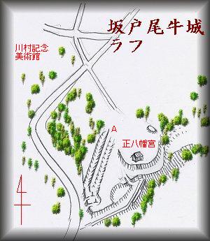| (以前の記述) 坂戸城は、川村美術館とすぐ東に隣り合った正八幡宮のある台地上にあった。千葉氏の重臣であった原遠江守胤守の居城であったという。 原氏の居城としては、700m東南に原殿屋敷と呼ばれる遺構もあり、この辺り一帯を領していたものであろう。後には原氏は臼井城に移り、宗家の千葉氏以上の勢力を扶植することになる。 正八幡宮のある台地は比高20mほどのもので、神社の周囲には腰曲輪状の郭が見られるが、台地の土手はほとんど削り落とされた跡は見られず、要害の良い台地ではない。 また、台地の基部は広大な畑地となって、川村美術館の方につながっている。というわけで、遺構の形態は良くは分からないというのが現状である。畑の辺りにはかつて台地の基部とを分断する堀などがあったのではないかと推測されるが、痕跡はもはや見られない。 後日、神社の裏側には見事な空堀があるという話を聞いた。しかし、その後訪れたたかし殿から、神社背後に東西に走る空堀状のものがあるが、これは小規模なもので、通路であろうという情報をいただいた。やはり遺構は存在していないのかもしれない。 |