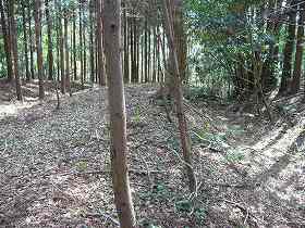どこまでが城域なのかはっきりしないが、先ほどの土塁の東側は一段低くなって、尾根が東に延びている。尾根といっても幅は7mほどはあり、郭のようでもある。この南側にはずっと土塁が続いている。 50mほど進むと写真の空堀跡のような部分があり、ここで一応城域は終わるかと思われる。しかし、さらに東側にも畑地となっている平地があり、どこまでが郭なのか、よく分からない。ここから先は私有地らしく、有刺鉄線が張られているので、内部に入ることができないのである。 時崎城は、小さいながらも、単郭の居館ではなく、一応、城らしい構造をしている。しかし、先に述べたように、その歴史等は不明である。 |