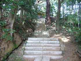 | Aの切り通し。二重の堀切のように見えないこともないが、実際はただの通路跡であろう。ただ、二重になっているという点が、あやしいといえばアヤシイ。 | 石段の下から見た正八幡宮。 |
