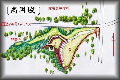 | (以前の記述) 高岡城は石川城の北1kmほどの位置にあり、城址の台地のすぐ北を、国道296号線のバイパスが通っていて、城址の何割かが削られている。バイパスを挟んですぐ北に佐倉東中学校がある。台地は比高20mほどで周囲は急峻な崖となっている。 土塁・空堀、虎口、櫓台、腰曲輪等残っていると言われるが、城址は山林化していて、内部に入ることは難しい。また発掘調査では特に建物跡も見つからなかったという。 木内薩摩守の城であったと言われているらしい。木内氏といえば千葉氏の一族で山田町の米野井城の木内氏が有名だが、その一族なのであろうか。 |