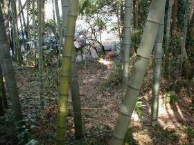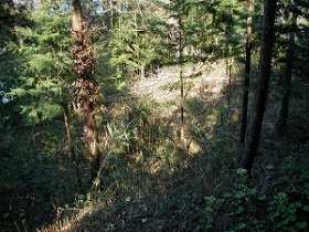 | 1郭と2郭との間の堀切。完全に掘り切るのではなく、中央部分を土橋によって直結している。南側の「屋敷跡」との間を分断するためであろうか。 | 北側は段々に小郭が下まで続いている。虎口関連の構造であろう。 |