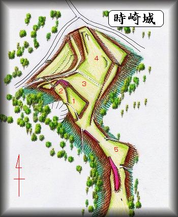 | (以前の記述) 時崎城は石川城の300mほど西の、比高20mほどの台地上にある。この辺は小さな城址がたくさんかたまっている地域で、石川城を中心として半径1km以内に、金部田城、城城、高崎城、高岡城、時崎城など6城もある。 これらは、だいたいは城城を中心とするネットワーク上にあったと思われるが、城主等の詳細は不明である。 |