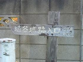 | 県道沿いの床屋さんの辺りから入っていく。このような案内表示があるが、よほど注意していないと通り過ぎてしまうだろう。 | 城址手前にある案内板。案内板の立っている所は堀の跡であるが、ほとんど埋められてしまっている。 |