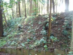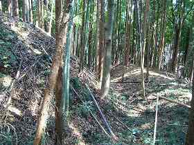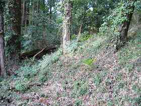 | 1郭東側の城塁と腰曲輪の様子。あまりにも垂直に削られているので、ちょっと怪しい。 | 西側下の居館部を取り巻く土塁。天然の地形を利用したものである。 |
