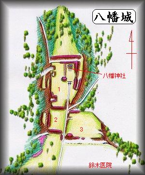 八幡城は、北側に向かって突き出した比高20mほどの台地の途中に1郭を置いている。先端を取り込んでいない構造で、この1郭と台地基部との間にあった2,3によって構成された3郭構造の城であったと思われる。城址には八幡神社がある。