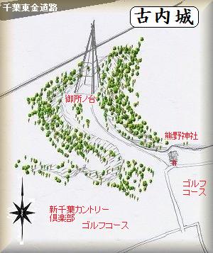 (以前の記述)古内城は、山武町の西のはずれ、東金市に近いところにあり、西に1.2kmに酒造城がある。比高20mほどの台地だが、城址の付近には新千葉カントリー倶楽部があり、また宅地にもなって、一部改変されているようだ。遺構も確認できなかった。城主等も未詳。