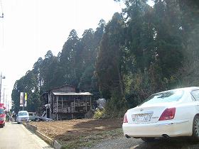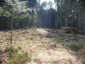 | 城の台城のある台地。比高20mほどである。この日、下の家で火事があったのか、消防車が道を塞いでいた。 | 台地上の様子。木が切られ重機が通った跡があるが、何か建設されるのであろうか。 |