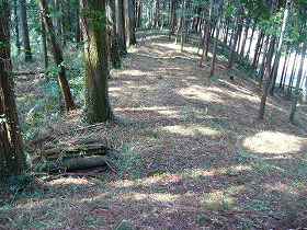1郭の西側には高さ1mほどの土塁が見られる。このような構造物があると一応城らしく見える。しかし、この城は細長いわりに堀切1本見られない。このような形態の城の場合、山上に堀切を置いて数郭に区画するのが常識であると思うのだが、そういう意味からすると非常識な城郭でもある。